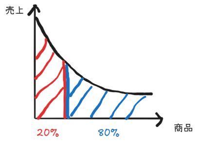 横軸に商品を並べ、縦軸に売上を取ります。左側に人気商品、右側にニッチ商品を配置すると、グラフは長い尾(ロングテール)のような形になります。
